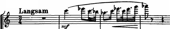 Its structure is very similar to the hallmark “Bruckner rhythm” (i.e. duplet + triplet), and is prominent throughout the first movement, and becomes an underpinning driving force. At the opening, it is an ostinato accompanies the main theme group on the lower strings, with a rather dark tone. The theme group has two parts, here’s the 4-bar Part A: